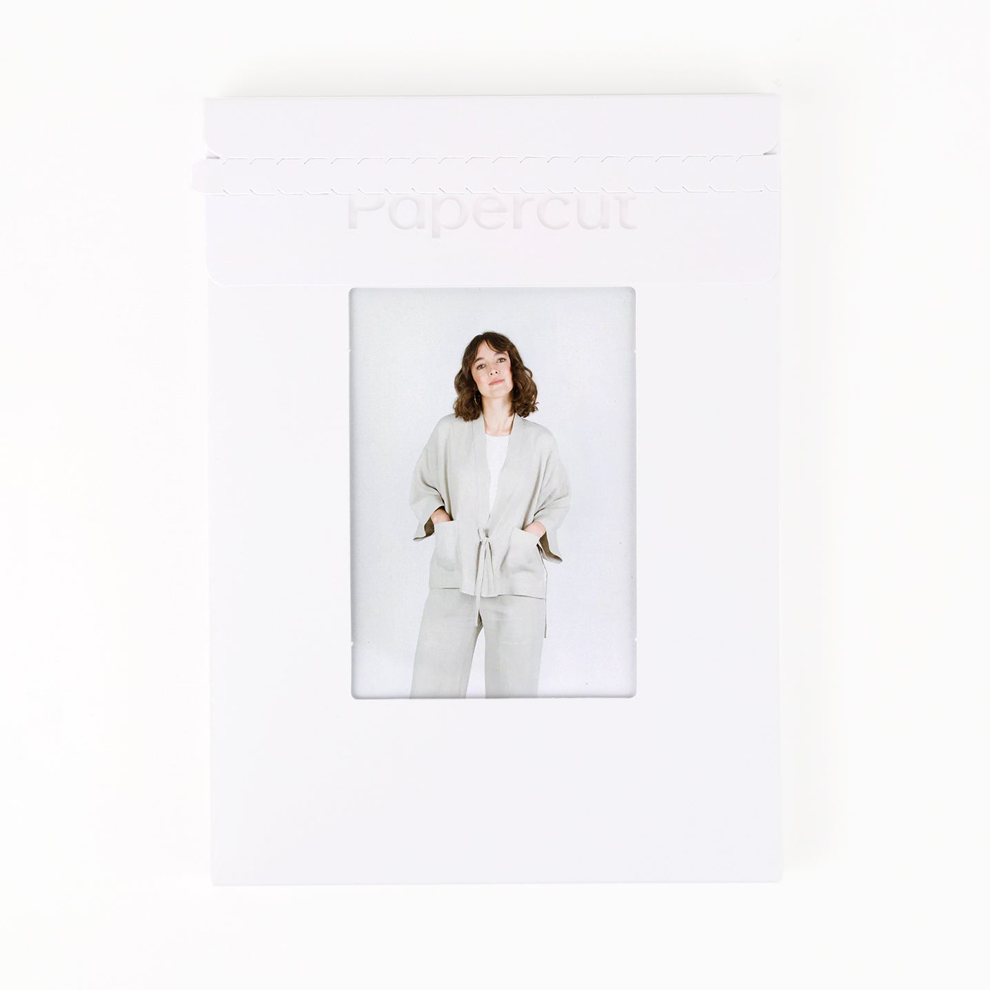 Papercut Patterns popular Luna Jacket. A boxy cropped jacket for any season. Make it in wool for winter or soft chiffon for summer, with three variations you'll have plenty of options. Features optional lining, 3/4 sleeves, drop shoulder, side seam splits, tie front and front patch pockets. This printed pattern hardcopy is made in New Zealand using recycled/recyclable materials.