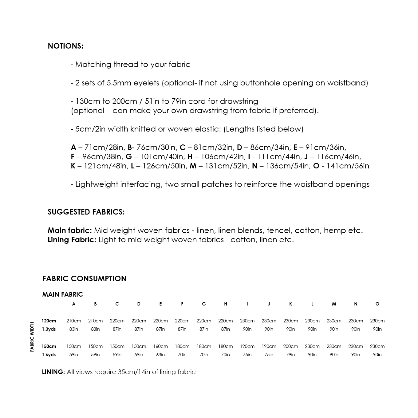 - Lightweight interfacing, two small patches to reinforce the waistband openings