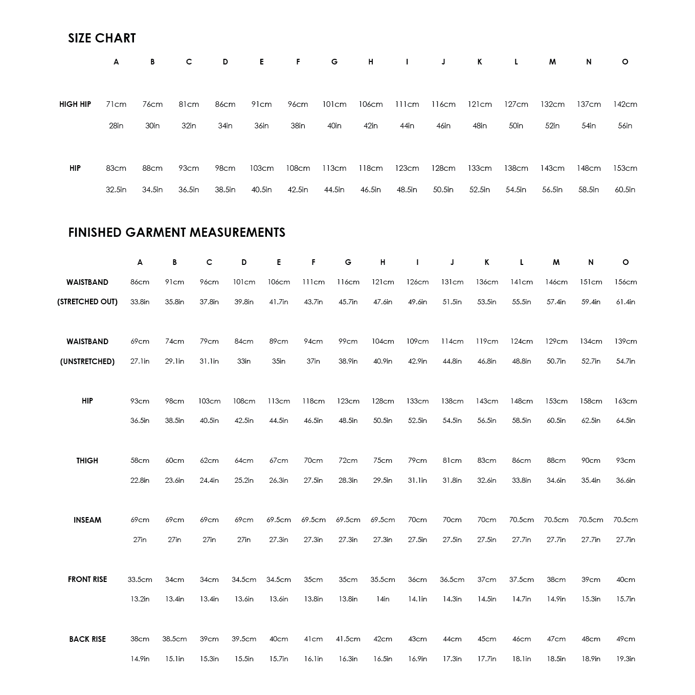F – 96cm/38in, G – 101cm/40in, H – 106cm/42in, I - 111cm/44in, J – 116cm/46in,