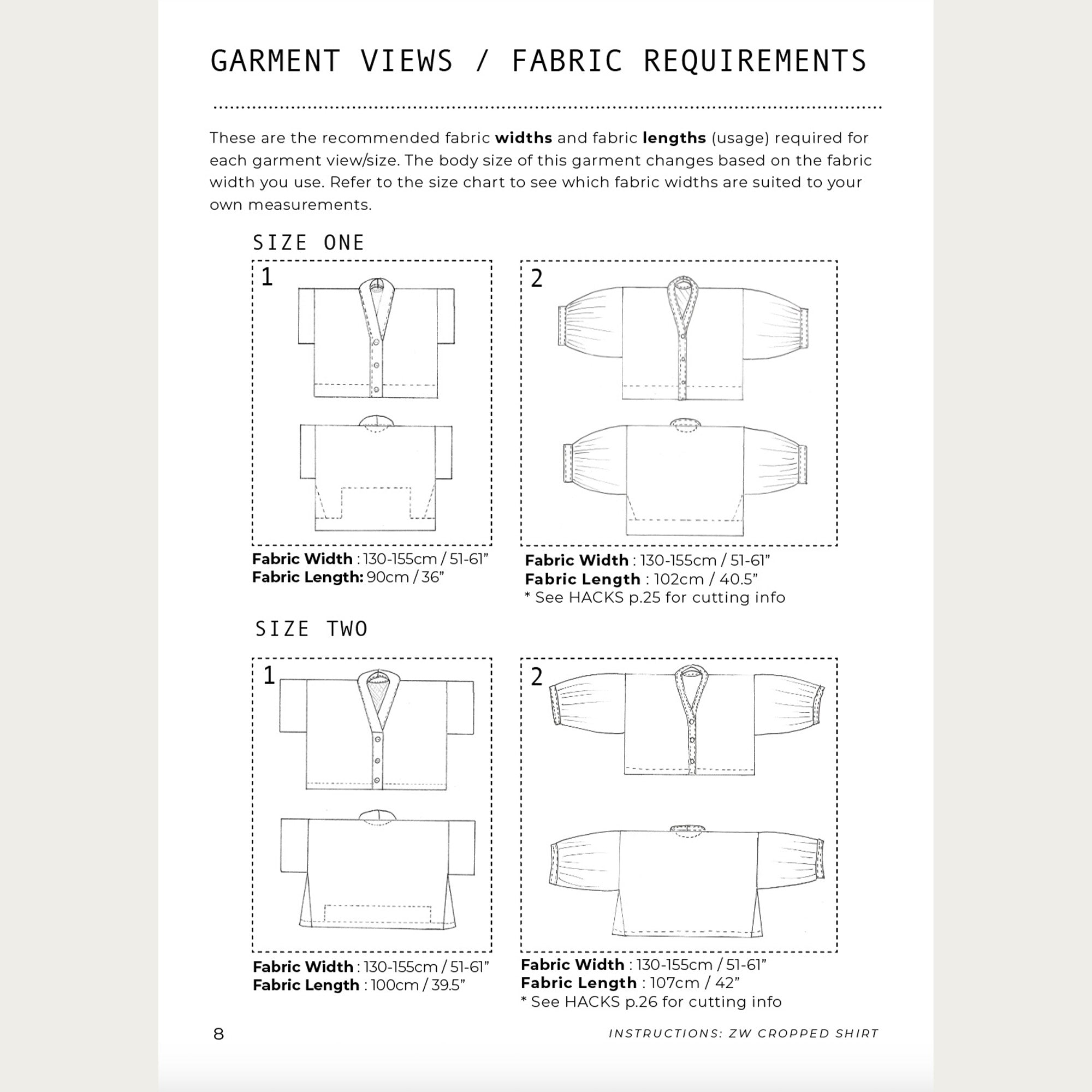 The Zero Waste (ZW) Cropped Shirt is an oversized style which has an attached neck band with buttons and button holes. It has decorative facings attached at the back and sides. It comes with a hack option to make a longer sleeve with a gathered hem and sleeve hem band. This pattern is very easy to lengthen or shorten yourself, and to use with different fabric widths.
