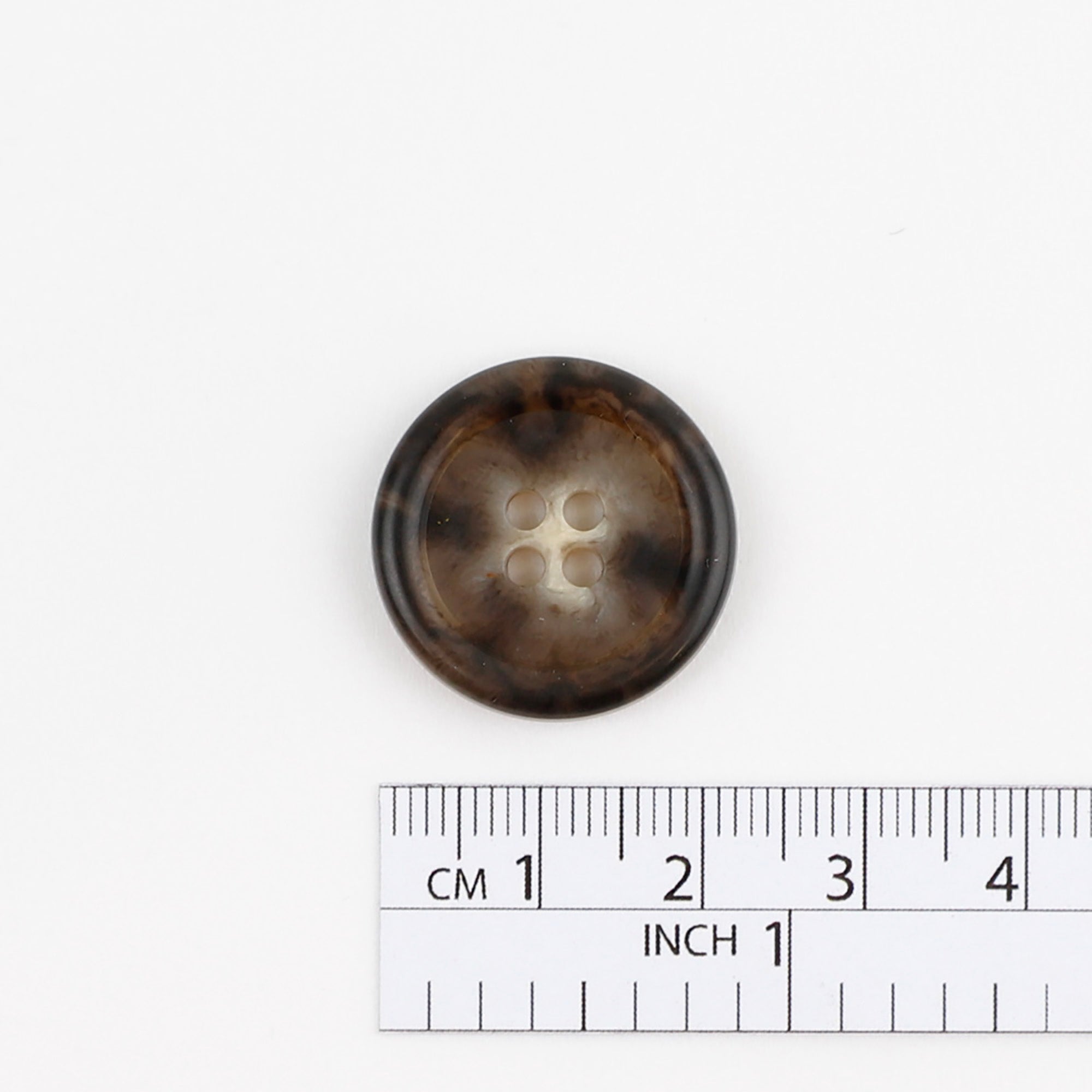 A plastic button in a brown/black/cream coloured faux tortoiseshell. This button has a lighter centre and darker rim and a subtle shine. A 4-hole button with a 2mm deep rim on the face and a subtly curved reverse. A classic button perfect for skirts, trousers, coats, DIY projects and accessories.