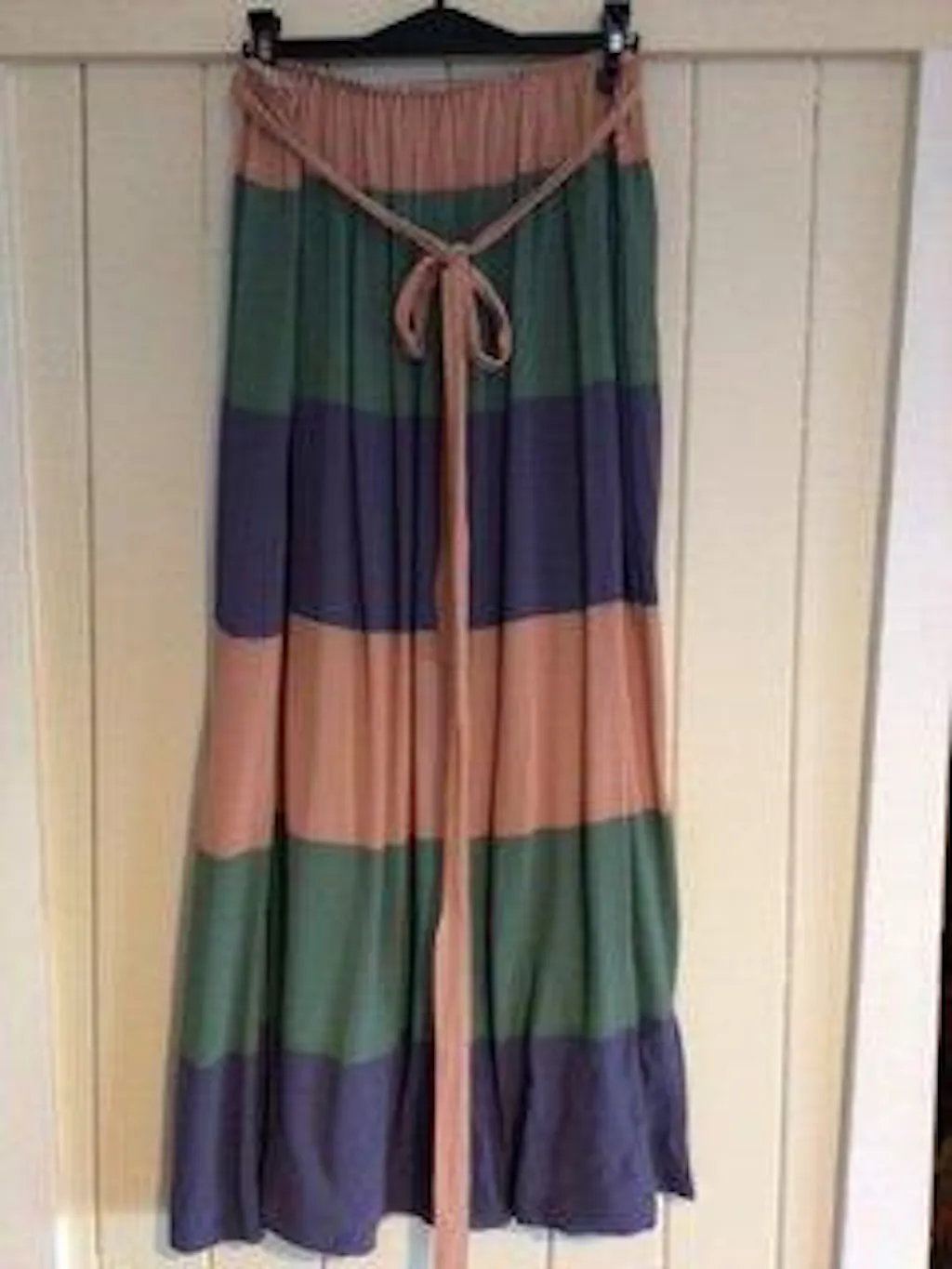This is a simple gathered skirt. I made a faced hem to hang well, as well as a side split. The tie bow/belt covers the waist gathers and adds interest!